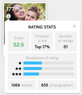 Sinds kort wordt ook aangegeven welk exact percentage hoort bij, in dit geval, 177 van de 1.069 foto’s en dat is nu bij de top 17%. Ook wordt er een score toegekend van 0 tot en met 100. Bij deze foto was dat een score van 52,5 en telt mee voor de wekelijkse rating op de website.