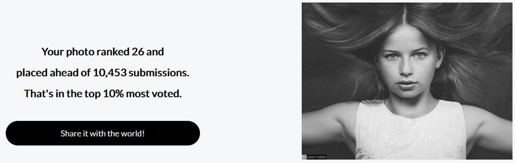 Bovenstaande foto van Catinca is doorgedrongen tot de 149 finalisten van de fotowedstrijd “Face in Black and White” op ViewBug, zo bleek uit de e-mail met als onderwerpregel: “Congratulations! You’ve received a photography award” die ik ontving.