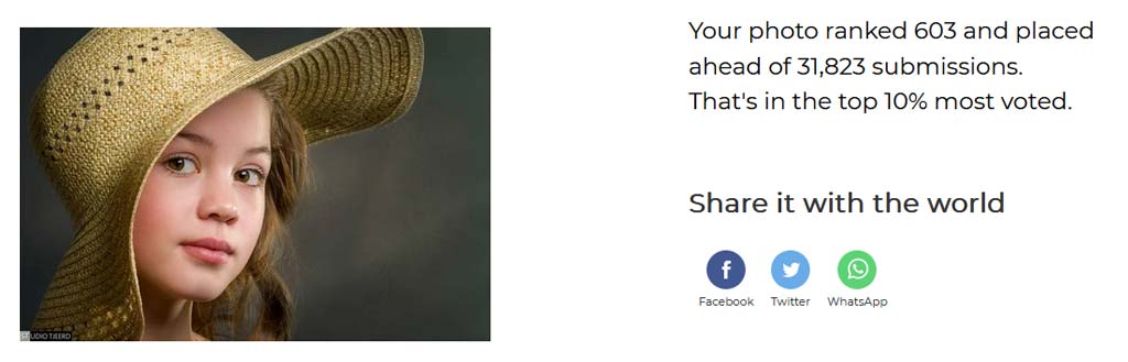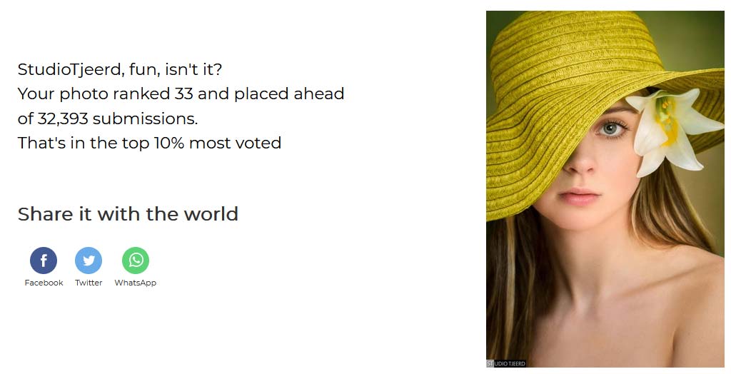 De kans om op de 33e plaats te eindigen is daarmee afgerond 0,10% en behoort daardoor logischerwijs tot de Top 10 Class (de top 10% van foto’s waarop door het publiek het meeste is gestemd).
