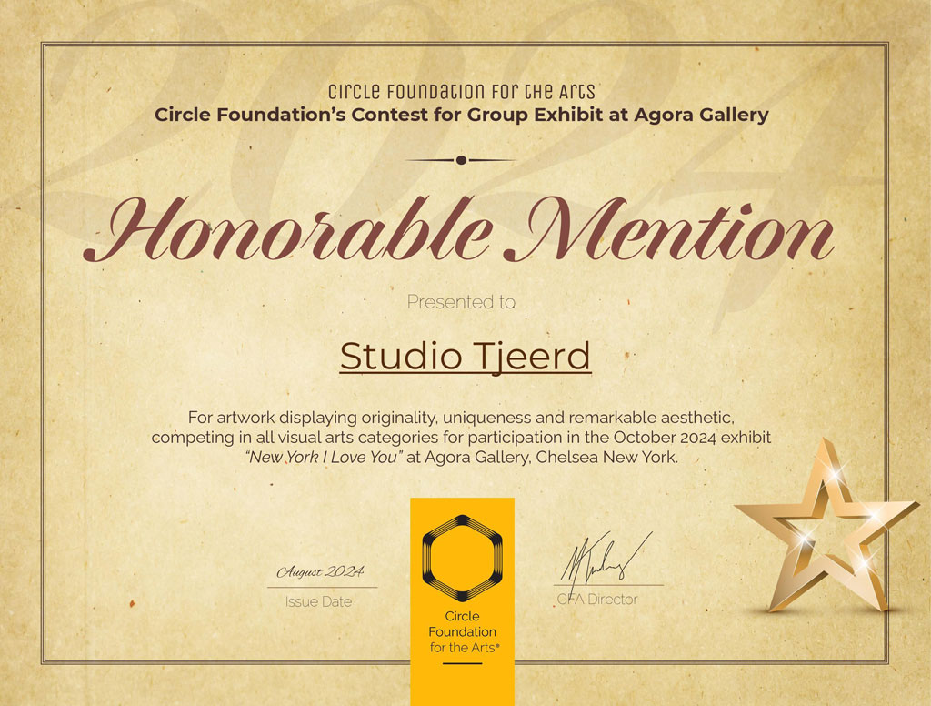 For artwork displaying originality, uniqueness and remarkable aesthetic, competing in all visual arts categories for participation in the October 2024 exhibit ‘New York I Love You‘ at Agora Gallery, Chelsea New York