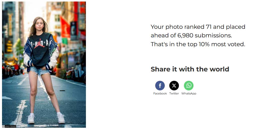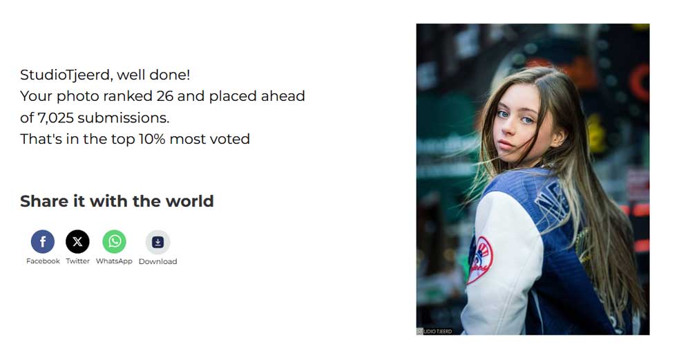 De kans om op de 26e plaats te eindigen bij deze wedstrijd is daarmee afgerond 0,37% en de foto behoort daardoor logischerwijs tot de Top 10 Class (de top 10% van foto’s waarop door het publiek het meeste is gestemd).