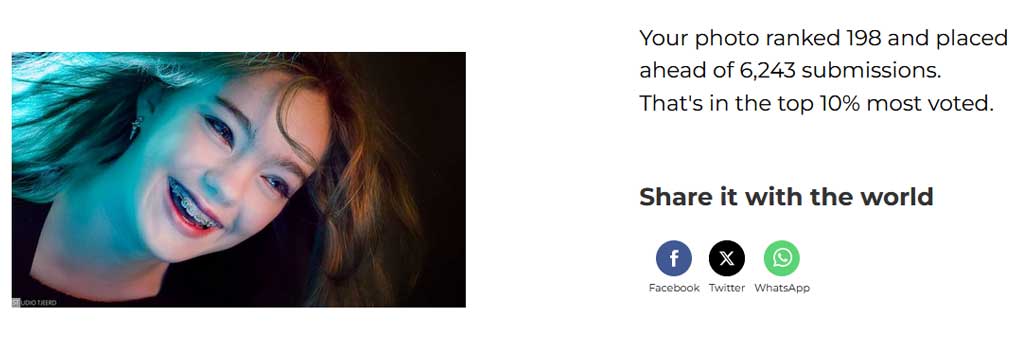 De kans om op de 10e plaats te eindigen bij deze wedstrijd is daarmee afgerond 0,16% en de foto behoort daardoor logischerwijs tot de Top 10 Class (de top 10% van foto’s waarop door het publiek het meeste is gestemd).