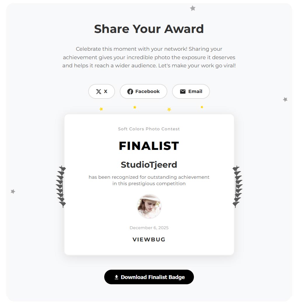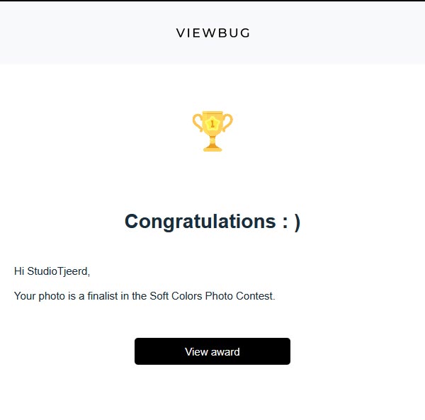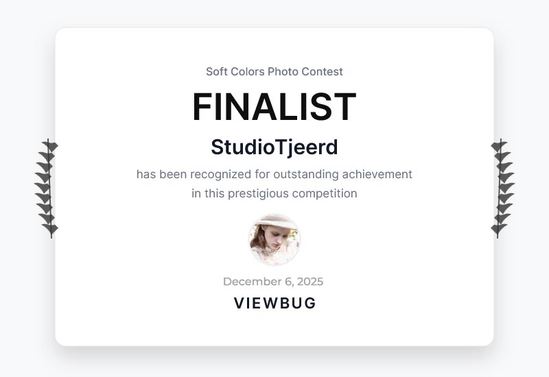 Het gaat om bovenstaande foto van Pien die is doorgedrongen tot de 146 finalisten van de fotowedstrijd “Soft Colors” op ViewBug, zo bleek uit de e-mail met als onderwerpregel: “Congratulations! You have received a photography award” die ik ontving.