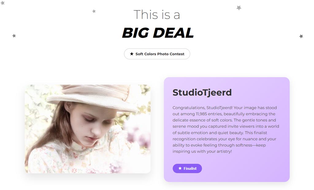 Standing out as a finalist among 11,985 entries is a remarkable achievement. Your delicate use of soft colors and gentle light captures an atmosphere of quiet beauty and emotion, demonstrating both technical skill and creative sensitivity. Your work brings a sense of calm and wonder to the community—keep expressing your unique vision and inspiring us all!”
