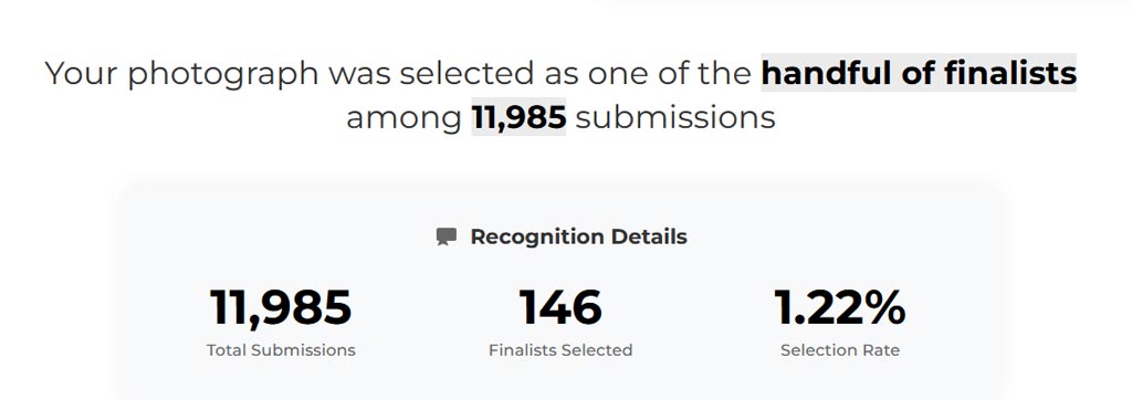 Dat deze foto een finaleplaats heeft behaald is op de website te vinden via de link die hoort bij de finalisten van de wedstrijd en getuige de award die bij de foto prijkt.