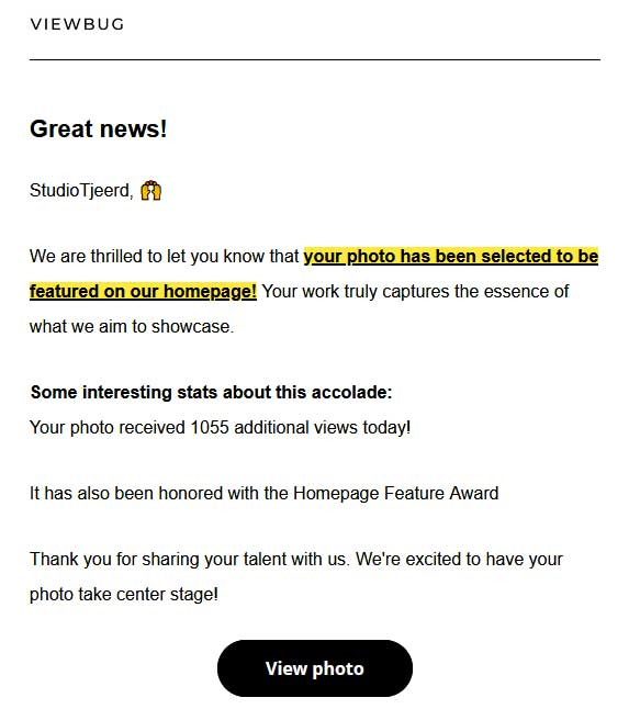 Het gaat om een feature op de homepage van ViewBug waar zowel de miljoenen leden als niet-leden de foto langs kunnen zien komen.