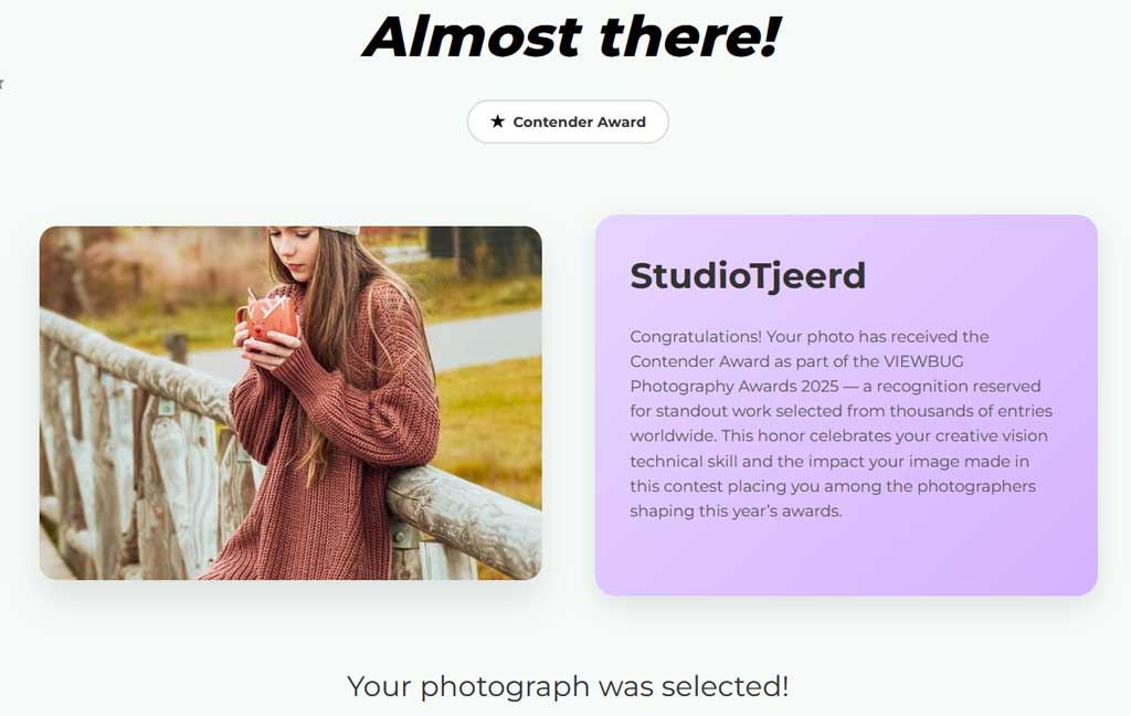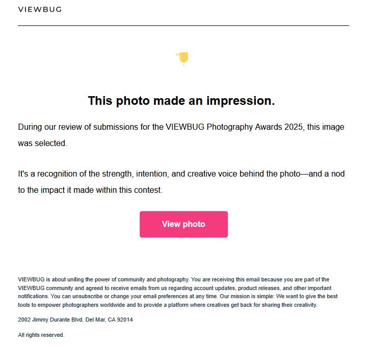 Your photo has received the Contender Award as part of the VIEWBUG Photography Awards 2025 — a recognition reserved for standout work selected from thousands of entries worldwide.